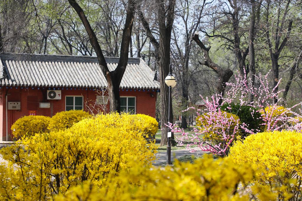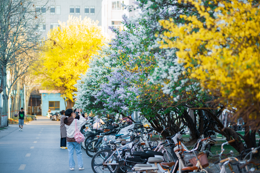 玉兰花瓣如凝脂般温润,或白、或粉、或紫,亭亭玉立缀满枝头;连翘金灿灿的细小花朵,如鎏金般铺满小径,为校园添上一抹亮色;紫叶李、红叶碧桃、美人梅,花朵清雅灵动、风姿绰约;榆叶梅、紫荆、贴梗海棠,花色艳丽、热烈奔放,格外夺人眼球;最是我校校花丁香,一夜之间花开校园,以最温婉的姿态迎接八方来客……