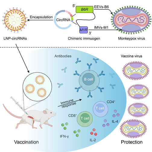 猴痘病毒是引发猴痘疫情的病原体,与天花病毒、痘苗病毒及牛痘病毒同属正痘病毒属,是一类重要的人畜共患传染病病原体,对人类和动物健康构成严重威胁。自2022年猴痘疫情全球暴发以来,世界卫生组织已于2022年7月23日和2024年8月14日两次宣布其为国际关注的突发公共卫生事件(PHEIC)。为更有效应对猴痘病毒的多种感染模式,研究团队设计并开发了将EEV抗原B6与IMV抗原M1串联融合的嵌合免疫原——CircRNAB6M1疫苗。相较于单价环状RNA混合疫苗及痘苗病毒天坛株疫苗,该疫苗在生产可及性与免疫操作可控性方面均具有显著优势。AlphaFold结构预测与SPR结合分析结果表明,B6与M1抗原的主要中和表位得以保留,未受融合影响,能够有效诱导小鼠产生针对猴痘病毒的强效且均衡的特异性抗体应答。检测结果表明,CircRNAB6M1疫苗可有效诱导小鼠产生针对B6与M1两种抗原的特异性抗体,显著增强对猴痘病毒的中和活性,并具备交叉中和痘苗病毒的能力;同时能够激发强烈的细胞免疫应答,促进IFN-γ、IL-2和IL-4等细胞因子的分泌。小鼠攻毒试验证实,CircRNAB6M1疫苗在面对高致死剂量(1×10⁶ PFU)痘苗病毒攻击时,仍能提供完全保护,且表现出良好的安全性。本研究成果为开发针对猴痘病毒及其他正痘病毒的疫苗提供了新的科学依据。