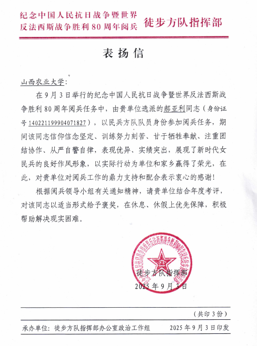 近日,我校收到纪念中国人民抗日战争暨世界反法西斯战争胜利80周年阅兵徒步方队指挥部发来的表扬信。信中对我校郝亚利同学在阅兵任务中的卓越表现给予高度肯定,对学校鼎力支持阅兵工作表达衷心感谢。