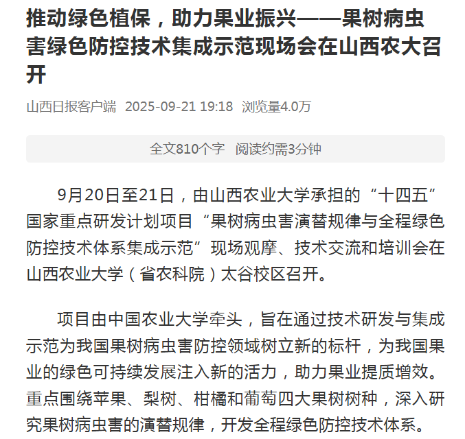 9月20日至21日,由山西农业大学承担的“十四五”国家重点研发计划项目“果树病虫害演替规律与全程绿色防控技术体系集成示范”现场观摩、技术交流和培训会在山西农业大学(省农科院)太谷校区召开。