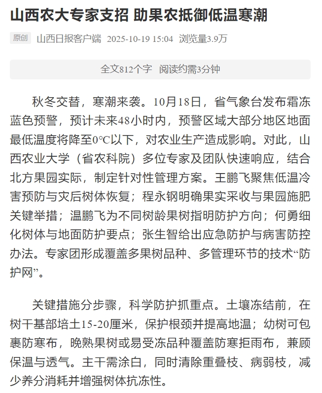 秋冬交替,寒潮来袭。10月18日,省气象台发布霜冻蓝色预警,预计未来48小时内,预警区域大部分地区地面最低温度将降至0℃以下,对农业生产造成影响。对此,山西农业大学(省农科院)多位专家及团队快速响应,结合北方果园实际,制定针对性管理方案。王鹏飞聚焦低温冷害预防与灾后树体恢复;程永钢明确果实采收与果园施肥关键举措;温鹏飞为不同树龄果树指明防护方向;何勇细化树体与地面防护要点;张生智给出应急防护与病害防控办法。专家团形成覆盖多果树品种、多管理环节的技术“防护网”。