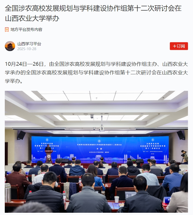 10月24日—26日,由全国涉农高校发展规划与学科建设协作组主办、山西农业大学承办的全国涉农高校发展规划与学科建设协作组第十二次研讨会在山西农业大学举办。
