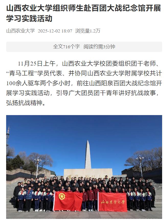 11月25日上午,山西农业大学校团委组织团干老师、“青马工程”学员代表、并协同山西农业大学附属学校共计100余人驱车两个多小时,前往山西阳泉百团大战纪念馆开展学习实践活动,引导广大团员团干青年讲好抗战故事,弘扬抗战精神。