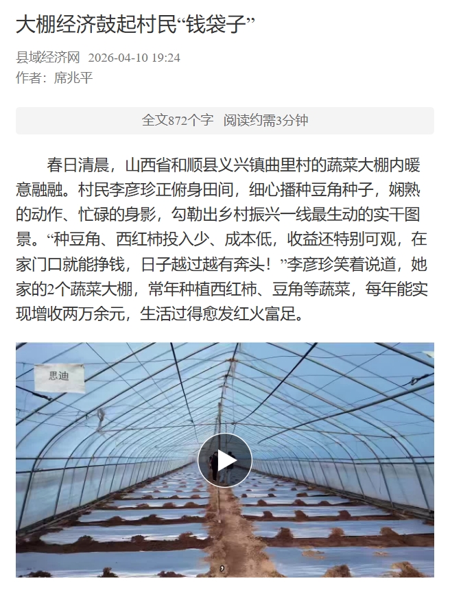 春日清晨,山西省和顺县义兴镇曲里村的蔬菜大棚内暖意融融。村民李彦珍正俯身田间,细心播种豆角种子,娴熟的动作、忙碌的身影,勾勒出乡村振兴一线最生动的实干图景。“种豆角、西红柿投入少、成本低,收益还特别可观,在家门口就能挣钱,日子越过越有奔头!”李彦珍笑着说道,她家的2个蔬菜大棚,常年种植西红柿、豆角等蔬菜,每年能实现增收两万余元,生活过得愈发红火富足。