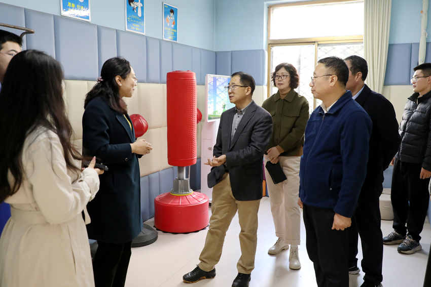 校领导实地察看了心理咨询室空间布局与隐私保护设计,了解了心理沙盘室沙具陈列架上不同类型的沙具,听取工作人员介绍该区域的核心功能与实际应用场景;认真观看了情绪宣泄室智能击打呐喊宣泄系统等专业宣泄疏导设施的操作流程,了解了不同设施的使用频率及适用人群。校领导还听取了心理健康指导中心关于师生互动典型案例分享,并重点问询了学生心理危机一、二、三级筛查比例及陪读人群相关情况,详细了解了中心工作人员配置情况,团队在日常工作中面临的具体问题与实际困难,全面了解了心理健康教育指导中心的工作现状。