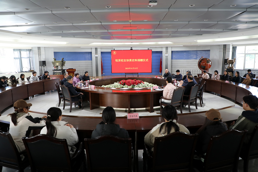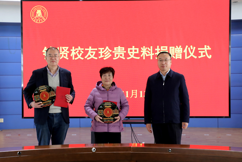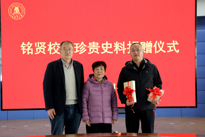 在捐赠环节,白群女士、陈凯先生代表家属向学校捐赠了校友白冰的37本珍贵日记及《流亡学童》书籍。党政办公室副主任韩明代表学校接收史料,规划合作部(校友办公室)部长程刚颁发捐赠证书,李卫祥回赠纪念品,定格校友的温情瞬间。陈凯先生作为校友家属代表发言,分享了史料整理过程中的感悟与体会,表示先辈们的求学之路与家国情怀令人动容,希望通过捐赠让更多人了解那段珍贵的历史,传承和弘扬铭贤校友的精神品质,为学校发展贡献力量。