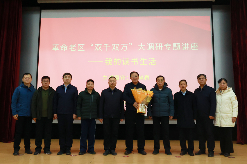 12月9日下午,由学校和山西省老区建设促进会联合举办的“革命老区‘双千双万’大调研专题讲座”在我校太谷校区书林堂举行。山西省广播电视局党组书记、局长,中国作家协会会员、省教育厅高校思想政治理论课特聘教授赵晓春应邀作题为《我的读书生活》的专题报告。省老促会副会长潘云,省老促会副秘书长、老区精神研究委员会主任李卫东,老区精神研究委员会副主任郭虎银,校党委副书记、校(院)长张强出席,校党委副书记李卫祥主持报告会,学校相关部门负责同志、各学院教师代表和学生代表现场聆听。