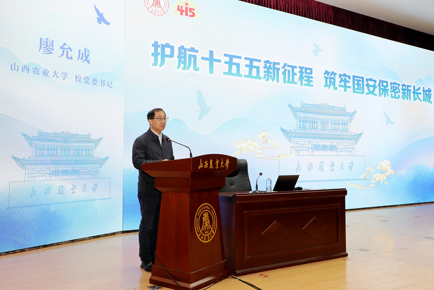 4月15日是第11个全民国家安全教育日,我校在太谷校区书林堂举办了“护航‘十五五’新征程 筑牢国安保密新长城”主题活动。我校党委书记廖允成、山西省国家保密局法规处处长刘迪山、山西省教育厅政策法规处副处长马志超出席活动。校党委常委、副校(院)长李捷主持活动。