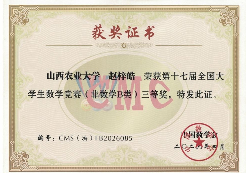 我校共392名同学报名参赛,基础部数学系教师团队对参赛同学进行了为期一个月的竞赛专题与综合培训。初赛中,我校学子表现优异,赵梓皓等10人获一等奖,张磊等27人获二等奖,岳彦博等59人获三等奖。其中资源环境学院土管2402班的赵梓皓同学在非数学B类初赛中成绩尤为突出,晋级全国总决赛。