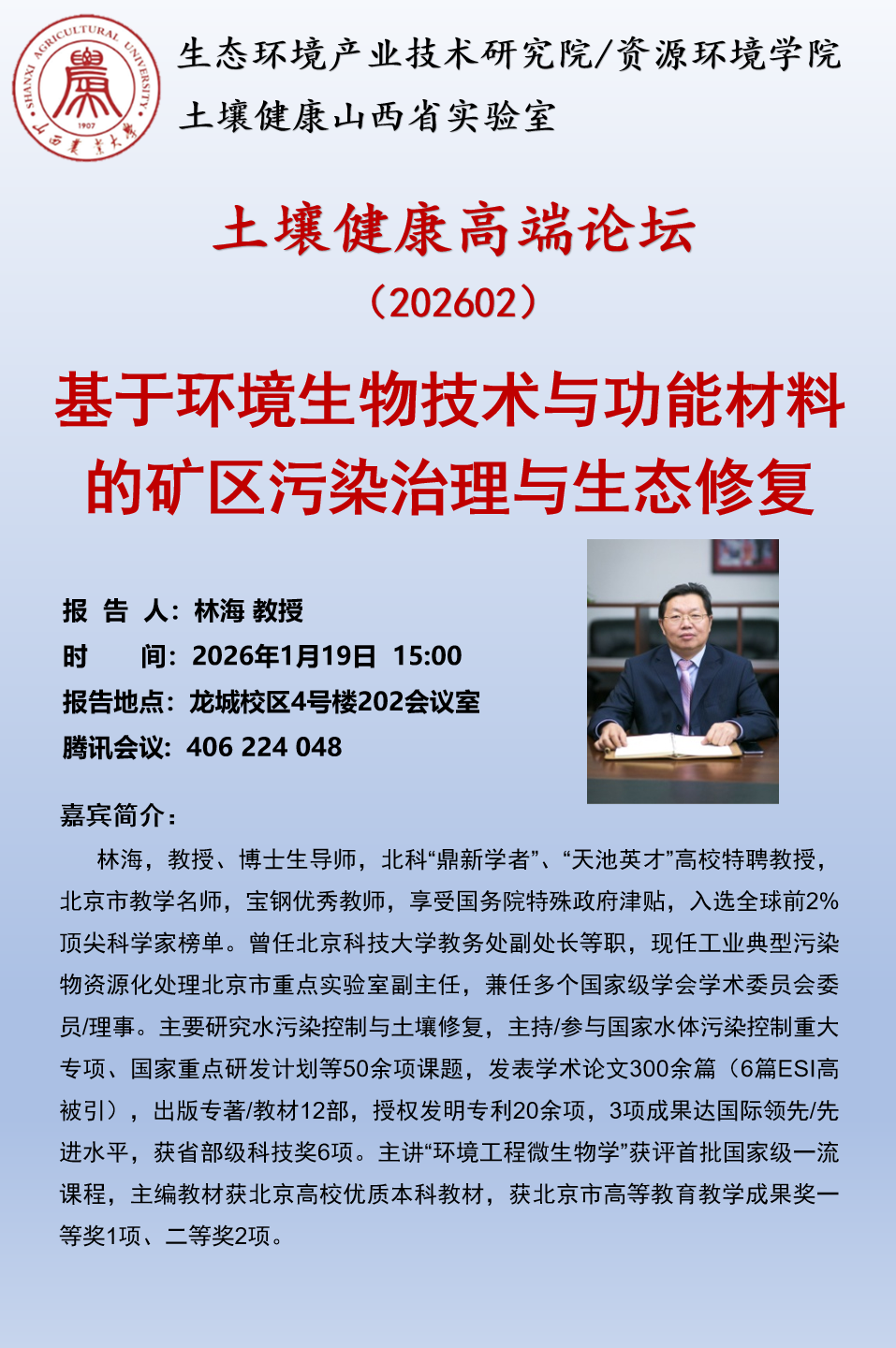 北京科技大学林海教授将于1月19日下午15:00做题为“基于环境生物技术与功能材料的矿区污染治理与生态修复”的学术报告(龙城校区4号楼202会议室),同步腾讯会议号:406 224 048。