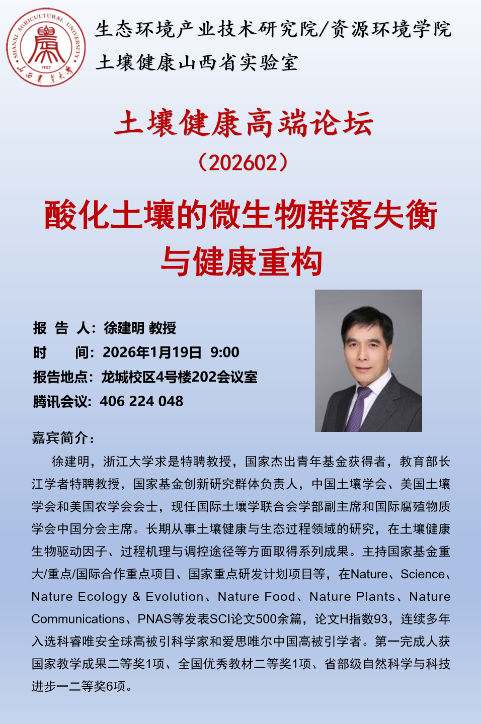应土壤健康山西省实验室邀请,浙江大学徐建明教授将于1月19日上午9:00做题为“酸化土壤的微生物群落失衡与健康重构”的学术报告(龙城校区4号楼202会议室),同步腾讯会议号:406 224 048。