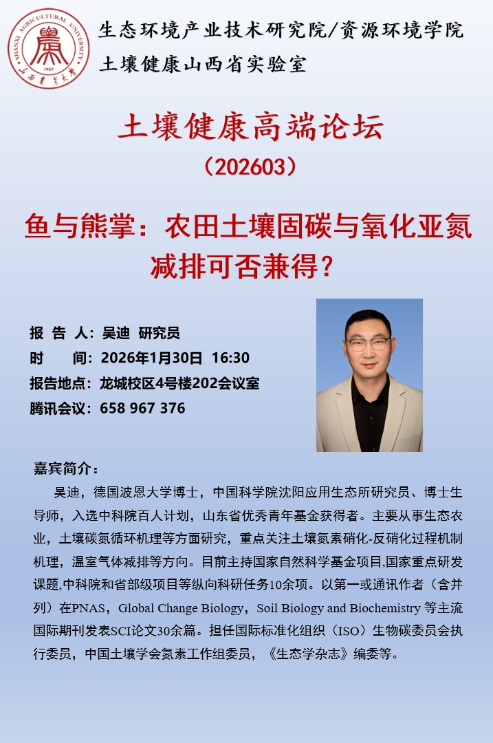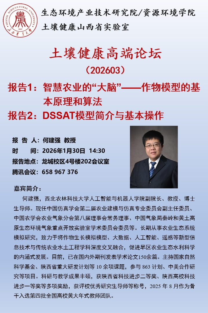 应土壤健康山西省实验室邀请,西北农林科技大学何建强教授、中国科学院沈阳应用生态所吴迪研究员将于2026年1月30日在龙城校区4号楼202会议室做学术报告,同步腾讯会议号:658967376。何建强教授的报告题为《智慧农业的“大脑”——作物模型的基本原理和算法》和《DSSAT模型简介与基本操作》。吴迪研究员的学术报告题为《鱼与熊掌:农田土壤固碳与氧化亚氮减排可否兼得?》。