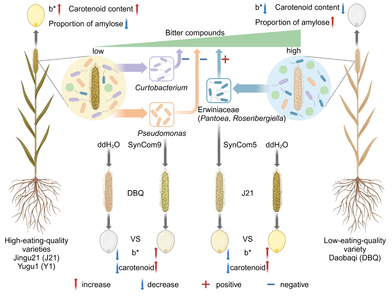 谷子品质不仅受品种遗传因素的影响,还受到土壤类型、作物管理措施以及环境生态条件等多方面因素的影响。近年来的研究表明,土壤微生物通过调节植物体内挥发性化合物和次生代谢物的含量,能够显著影响作物的品质和风味。然而,关于叶际(植物地上部)微生物和代谢物对谷子品质的影响仍不清楚。该研究系统揭示了谷子(Setaria italica)叶际微生物组在品质形成中的关键作用机制,为谷子品质改良和生产实践优化提供了理论基础。研究结果显示,高食用品质谷子穗部有13种代谢物含量显著降低,其中包括4种苦味物质。这些差异积累的代谢物,与高食用品质谷子穗部显著富集的2个细菌属,短小杆菌属Curtobacterium和假单胞杆菌属Pseudomonas的丰度呈负相关。进一步分析表明,这两个细菌属的富集,与苦味化合物含量下降、谷物粘度提高显著相关。通过合成菌群接种验证试验,研究进一步证实,这些微生物可通过提高米色黄度(b*值)、降低苦味物质积累,有效改善谷子食用品质。