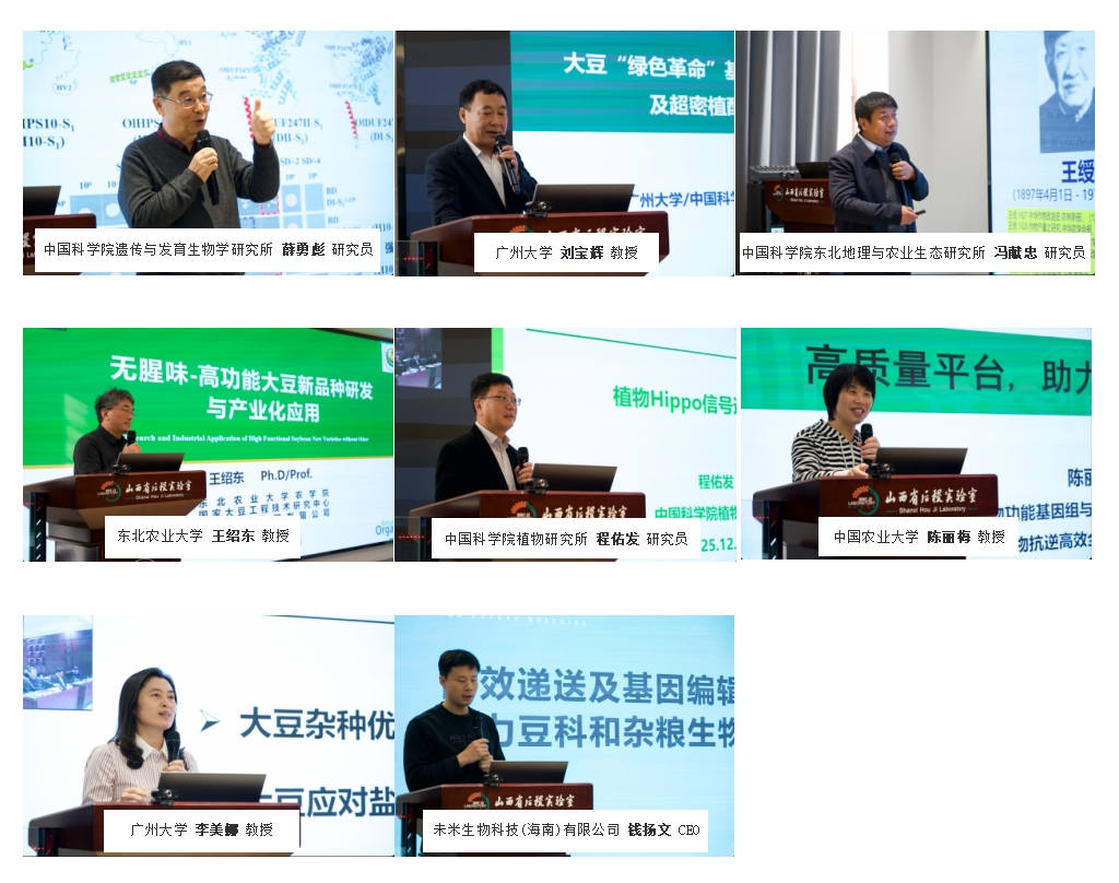 整场报告会围绕“豆科作物绿色革命与高产新范式”这一主线,形成“机理解析—基因挖掘—品种设计—技术支撑—产业落地”的完整创新链条,可概括为以下四点:一是基础突破:薛勇彪研究员揭示野生稻自交不亲和的分子演化规律,为豆科杂交机制提供借鉴;程佑发研究员解析植物Hippo 信号通路,拓展了器官大小与抗逆调控的新靶点。二是基因与种质创新:刘宝辉教授提出“绿色革命基因+超密植”范式,育成矮秆耐密“东生89”;冯献忠研究员展示大豆分子设计育种平台,实现多基因聚合与快速迭代;李美娜教授阐明雄性不育分子机制,建立大豆杂种优势利用技术体系。三是平台与技术支撑:陈丽梅教授分享高质量科研平台对高水平产出的“加速器”效应。四是品种升级与产业化:王绍东教授推出无腥味、高功能成分大豆新品种,打通“研发—加工—市场”全链;钱扬文CEO以高通量精准基因编辑平台,支撑杂粮、豆科作物的快速定向改良。会议凝练出“基因挖掘先行、分子设计加速、配套技术跟进、产业需求牵引”的豆科作物绿色革命新路径,为提升山西乃至全国大豆与杂豆产能与产业竞争力提供了有效解决方案。