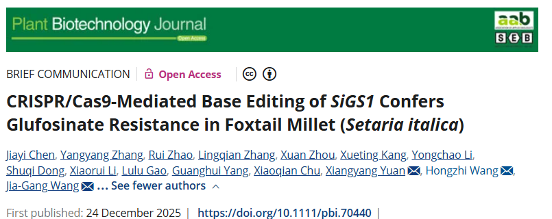 12月24日,我校农学院谷子产业化技术创新团队在Plant Biotechnology Journal上发表题为“CRISPR/Cas9-Mediated Base Editing ofSiGS1Confers Glufosinate Resistance in Foxtail Millet (Setaria italica)”的研究论文。在本研究中,通过腺嘌呤碱基编辑器(ABE8e)对SiGS1基因进行精确编辑,成功产生了S59G-T60A(SGTA)突变,同时编辑植株对草铵膦表现出稳定的抗性。