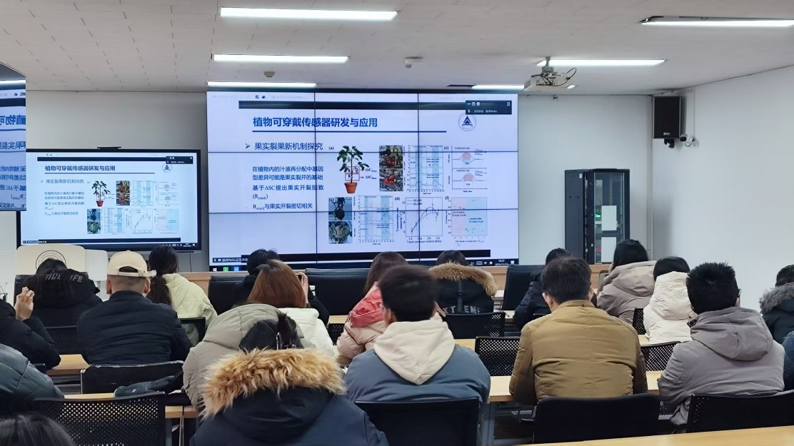 徐沛研究员以“智慧园艺:表型组学驱动的园艺前沿”为题,围绕智慧园艺的发展背景、智慧园艺的核心内涵、表型组学的概念及其应用、以及如何利用表型组学和人工智能进行植物缺素的早期诊断、智能灌溉革新反馈灌溉模式等方面内容进行了介绍。他重点分享了实验室在植物可穿戴传感器研发及应用、Plantarray生理表型组平台应用等方面的工作。同时,结合Plantarray从宏观角度及PlantRing从微观角度构建多维度检测网络方面,他精准地阐述了自己独到的观点。最后,徐沛研究员与在场师生围绕数据采集、表型解析、系统建模等表型组到遗传增益、预测农业、智能反馈等“后表型组”等多学科交叉驱动智慧园艺方面问题,进行了高质量的互动交流。