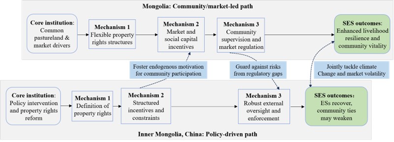 研究指出,这种“殊途同归”的复苏背后有着不同的驱动机制。内蒙古的改善主要得益于强有力的生态保护政策干预,如“草畜平衡”管理、生态补偿等一系列国家和地方工程措施,有效推动了大规模的草原生态恢复(相关结果前期已在Environmental Impact Assessment Review(IF:11.2)期刊发表)。相比之下,蒙古国的改善则更多归功于注重社区参与的自然生态系统管理模式,其中明确了利益相关者的角色,整合了当地传统知识,在提升生态保护效果的同时增强了牧民生计。