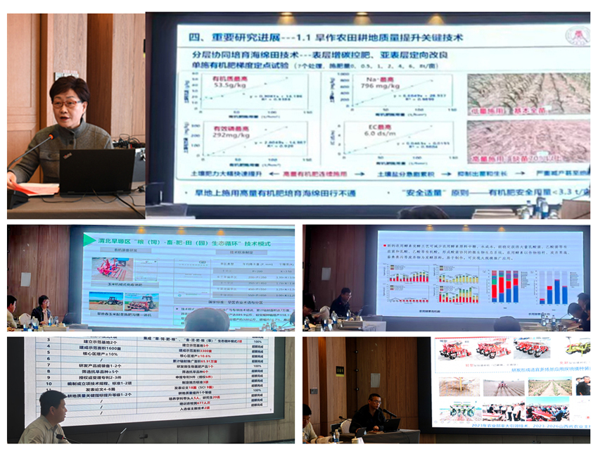 会上,王娟玲研究员、西北农林科技大学温晓霞教授、中国农业大学陈阜教授、内蒙古世农科技有限公司任永峰研究员、山西襄垣仁达机电设备有限公司赵旭志副研究员,分别代表“晋中晋东黄土丘陵区有机旱作沃土节水循环增效技术模式与应用”“晋陕黄土旱塬区有机旱作增碳扩容高效用水技术模式与应用”“晋北农牧交错带有机旱作生态循环提质增效技术模式与应用”“蒙冀半干旱风沙区有机旱作抗逆保土生态种植技术模式与应用”“有机旱作农业新产品新装备研发与应用”五个课题,从课题基本情况、任务完成情况、重要研究成果与技术进展、标志性成果及创新性、组织管理及人员配置、经费投入与使用等方面作了详细汇报。