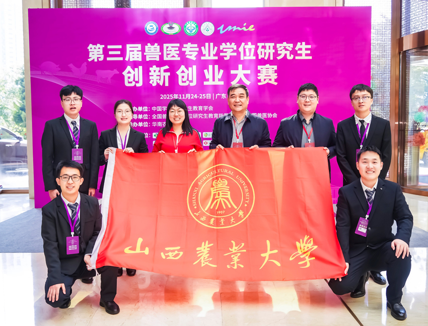 11月25日,第三届兽医专业学位研究生创新创业大赛决赛在广州举行。由我校动物医学学院中兽医药现代化山西省重点实验室李宏全、孙娜教授指导,以丁文文博士为队长,上官琳晖、张司寰、贺子龙、刘金涛为队员组成的“兽用组分中药领跑者”团队入围决赛并获全国二等奖。该团队已连续两年在此项比赛中入围决赛并获奖。