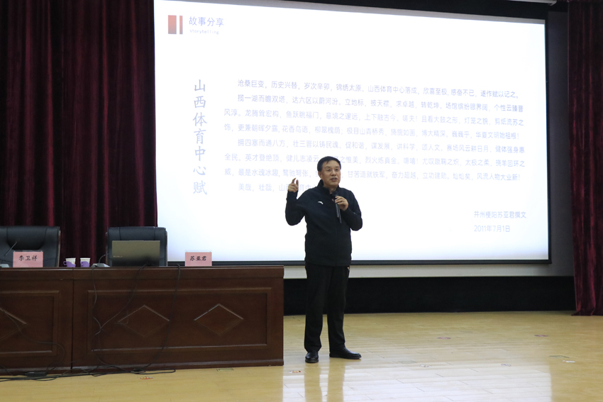 12月5日下午,我校特邀中国老年人体育协会副主席、山西省老年人体育协会主席、山西省政协智库专家、山西省体育局原党组书记、局长苏亚君在太谷校区书林堂作题为《体育精神与教育文化》的专题报告。校党委副书记李卫祥主持报告会,宣传统战部、校团委负责人,体育部全体教师和学生代表共同聆听报告。