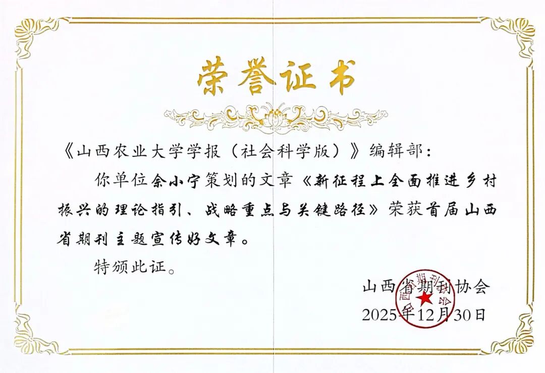 与此同时,《学报》刊载的时任农业农村部(国家乡村振兴局)中国扶贫发展中心主任,黄承伟研究员撰写的《新征程上全面推进乡村振兴的理论指引、战略重点与关键路径》一文,在众多参评作品中脱颖而出,荣获“山西省期刊主题宣传‘好文章’”称号。文章立足新时代乡村振兴战略实施背景,深入剖析了乡村振兴的理论根基、战略重点与实践路径,论证严谨、见解深刻,为全国乡村振兴事业的深入推进提供了宝贵的学术参考。