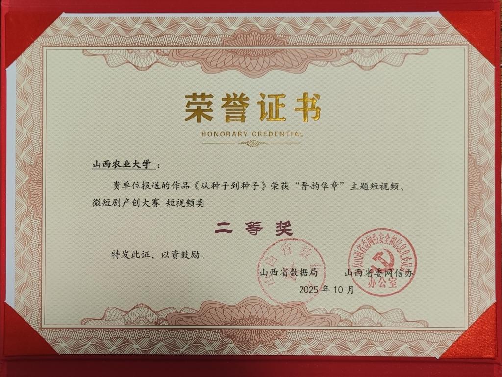 近日,我校报送的作品《从种子到种子》凭借鲜明的农业特色与精良的创作质量,在“晋韵华章”主题短视频、微短剧产创大赛中脱颖而出,斩获短视频类二等奖。