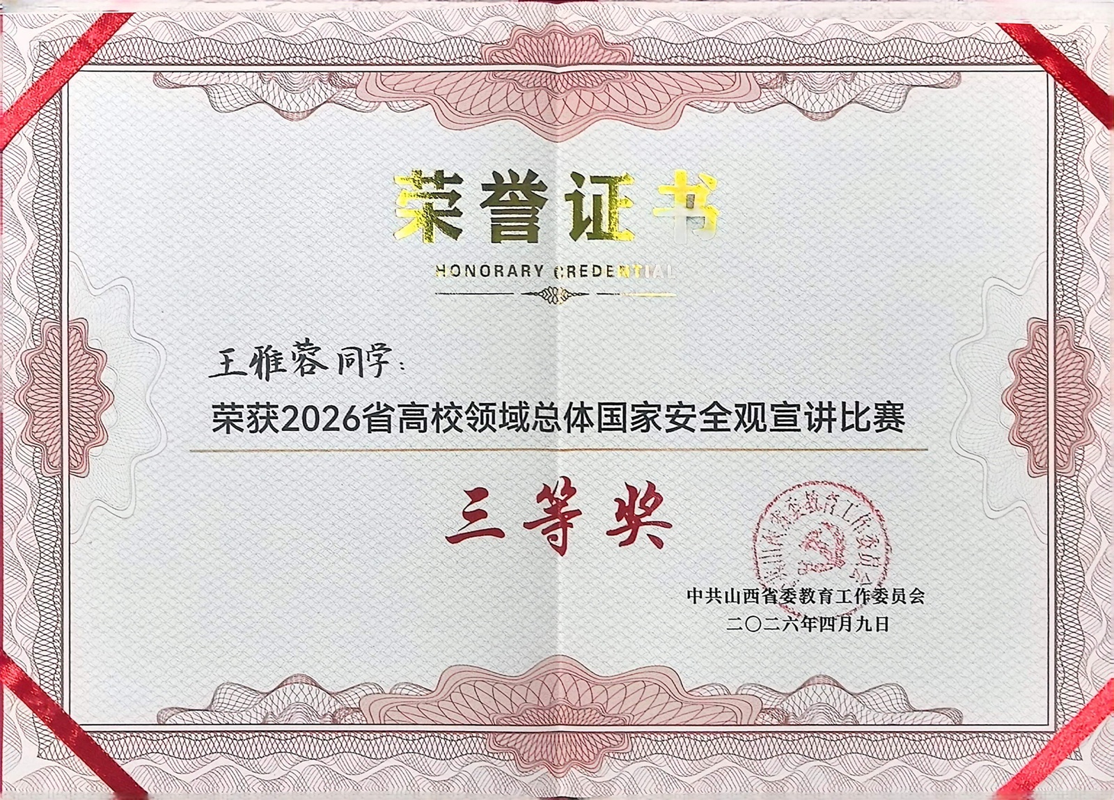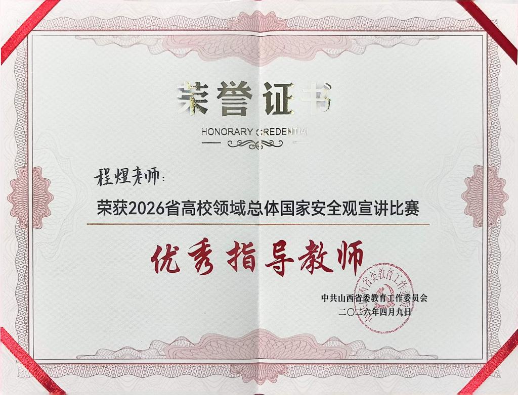 近日获悉,我校学生王雅蓉在全省高校领域总体国家安全观宣讲比赛中荣获三等奖。全省高校领域总体国家安全观宣讲比赛由中共山西省委教育工作委员会主办,以“统筹发展和安全 护航‘十五五’新征程”为主题,旨在深化高校国家安全教育,营造浓厚育人氛围。