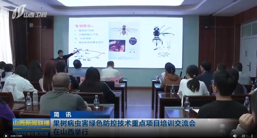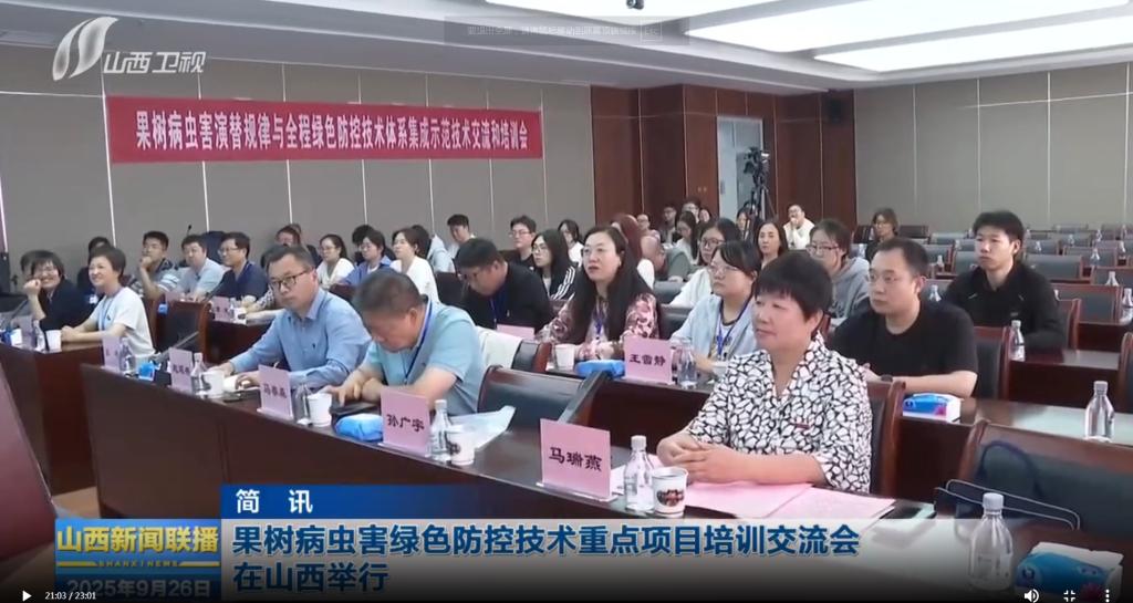 9月26日,《山西新闻联播》播发新闻,报道了由我校植物保护学院承办的果树病虫害绿色防控技术重点项目培训交流会。会议通过线上线下相结合的方式,通过现场观摩、技术培训与学术交流等形式,展示项目阶段性成果,推动果业提质增效与可持续发展。