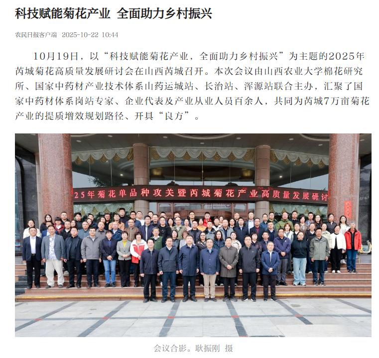 10月19日,以“科技赋能菊花产业,全面助力乡村振兴”为主题的2025年芮城菊花高质量发展研讨会在山西芮城召开。本次会议由山西农业大学棉花研究所、国家中药材产业技术体系山药运城站、长治站、浑源站联合主办,汇聚了国家中药材体系岗站专家、企业代表及产业从业人员百余人,共同为芮城7万亩菊花产业的提质增效规划路径、开具“良方”。