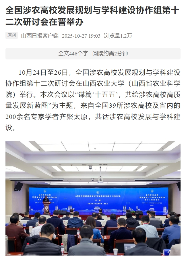 此次会议为全国涉农高校搭建了交流合作平台,也为山西农业教育与科研发展注入新动力,对推动涉农高校服务农业强国建设、助力乡村振兴具有重要意义。据了解,会议由全国涉农高校发展规划与学科建设协作组主办、山西农业大学承办;与会代表还深入山西农业大学龙城校区、太谷校区,实地考察山西农业科研与教育成果。