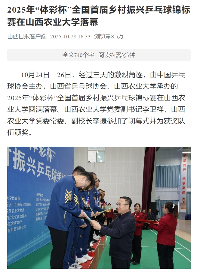 10月24日-26日,经过三天的激烈角逐,由中国乒乓球协会主办,山西省乒乓球协会、山西农业大学承办的2025年“体彩杯”全国首届乡村振兴乒乓球锦标赛在山西农业大学圆满落幕。山西农业大学党委副书记李卫祥,山西农业大学党委常委、副校长李捷参加了闭幕式并为获奖队伍颁奖。