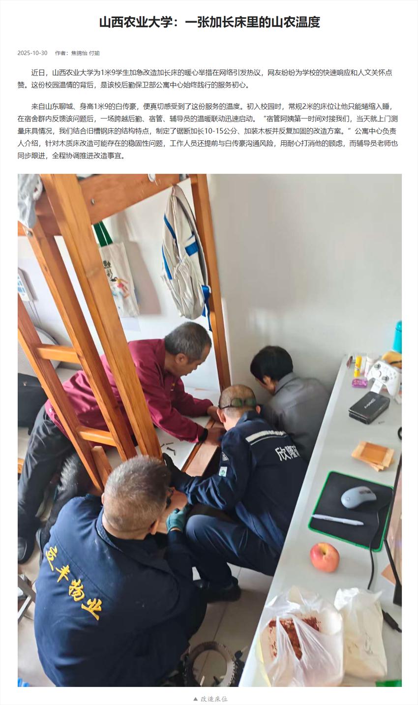 近日,山西农业大学为1米9学生加急改造加长床的暖心举措在网络引发热议,网友纷纷为学校的快速响应和人文关怀点赞。这份校园温情的背后,是该校后勤保卫部公寓中心始终践行的服务初心。