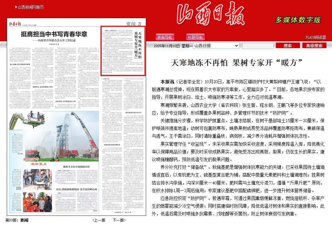 寒潮频繁来袭,山西农业大学(省农科院)张生智、程永钢、王鹏飞等多位专家快速响应,给予专业指导,形成覆盖多果树品种、多管理环节的技术“防护网”。