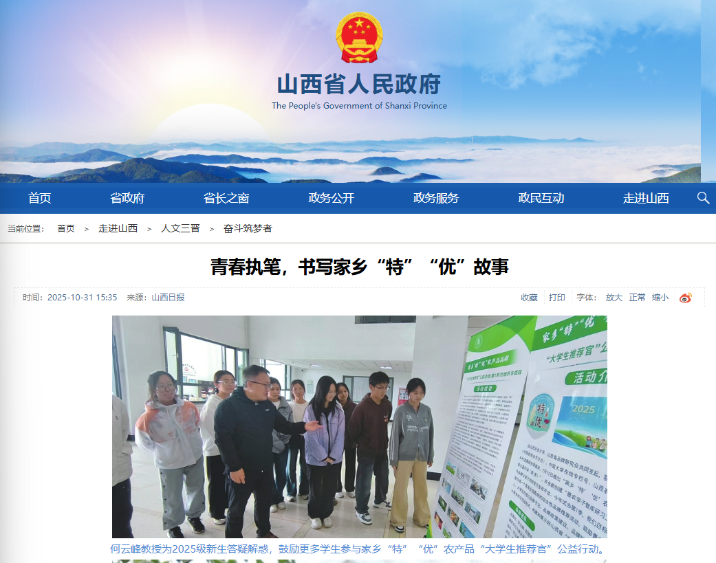 “84名青年学子聚焦家乡‘特’‘优’农产品的深入调研与宣传,作品总点击量超过7万次。这是我们参与推动‘特’‘优’农业产业高质量发展与专业育人场景创设改革的一次新尝试。”活动由山西农业大学(省农科院)与山西省品牌研究会联合发起,作为活动总策划人,山西农业大学(省农科院)教授何云峰被师生们的参与热情及地方政府的积极态度感动与震撼。10月25日采访时,他兴奋地告诉记者,“大学生推荐官”公益行动(第1季)取得了阶段性新进展,青年学子用踏踏实实的行动写下投身乡村振兴和农业强国建设的铿锵誓言。