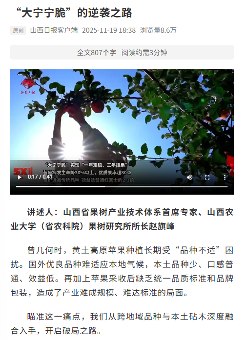 “接穗”决定果实品质、“砧木”决定果树的适应性和抗逆性,二者共同决定了苹果特性。为破解传统选种难兼顾口感、适应性与丰产性的难题,我们团队反复试验,将西北农林科技大学“秦脆”作接穗,嫁接到自主选育的砧木“SXND-1”上,这样既保留“秦脆”酥脆酸甜的品质,又让果实成熟期提前15-20天,抗苦痘病等能力显著增强,更好地适配黄土高原环境。