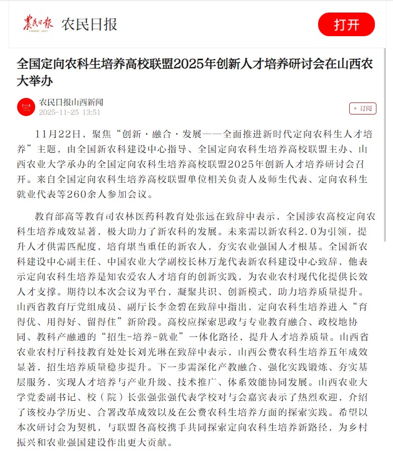 11月22日,聚焦“创新·融合·发展——全面推进新时代定向农科生人才培养”主题,由全国新农科建设中心指导、全国定向农科生培养高校联盟主办、山西农业大学承办的全国定向农科生培养高校联盟2025年创新人才培养研讨会召开。来自全国定向农科生培养高校联盟单位相关负责人及师生代表、定向农科生就业代表等260余人参加会议。