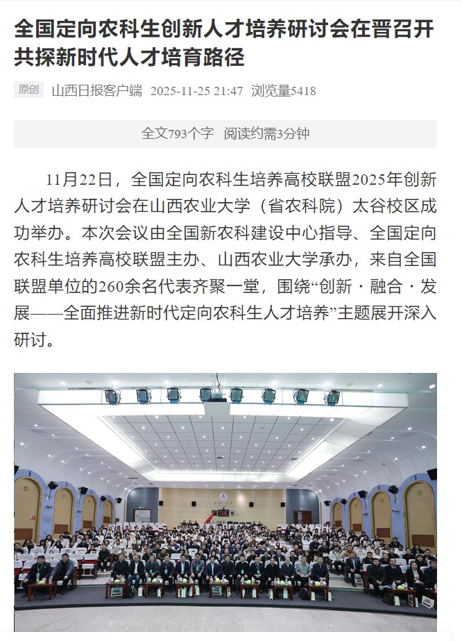 11月22日,全国定向农科生培养高校联盟2025年创新人才培养研讨会在山西农业大学(省农科院)太谷校区成功举办。本次会议由全国新农科建设中心指导、全国定向农科生培养高校联盟主办、山西农业大学承办,来自全国联盟单位的260余名代表齐聚一堂,围绕“创新・融合・发展——全面推进新时代定向农科生人才培养”主题展开深入研讨。