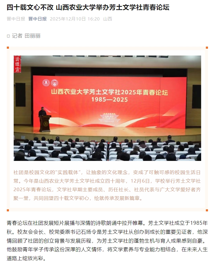 四十年间,芳土文学社如校园文化沃土中一粒生生不息的种子,以笔墨凝聚学子精神共鸣,有力推动了校园文化发展与农大学子成长,为一代代学子构筑了以文会友、滋养精神的家园。未来,芳土文学社将继续守护人文初心,引领青年以文铸魂、以笔追梦,共同书写属于新时代的青春篇章。