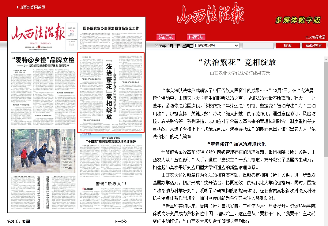 山西农大通过新章程为依法治校夯实基础,重新界定校院(所)关系,进一步激发基层办学活力,初步形成“统分结合、协同高效”的现代化大学治理格局。同时,围绕“法治助力科学研究”,明晰了科研机构的职能与体制,还在省内高校首次对法人科研机构治理体系作出规定,通过制度创新为科学研究注入强劲动能。