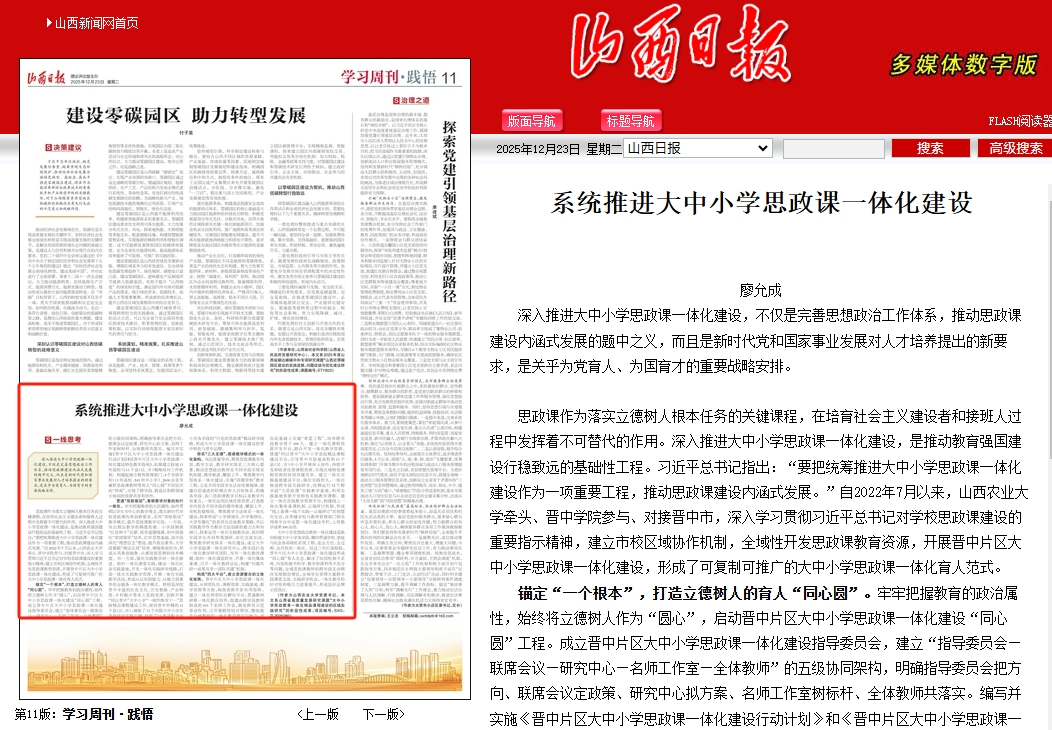 12月23日,《山西日报》“践悟”版刊发校党委书记廖允成署名文章《系统推进大中小学思政课一体化建设》。文章从打造立德树人的育人“同心圆”、着眼教学对象的知行一体化、搭建教学模式的一体化架构、建立资源整合的立体化矩阵四个方面,深入阐述了由我校牵头、晋中学院参与、对接晋中市开展的晋中片区大中小学思政课一体化工作的探索实践和取得成效。