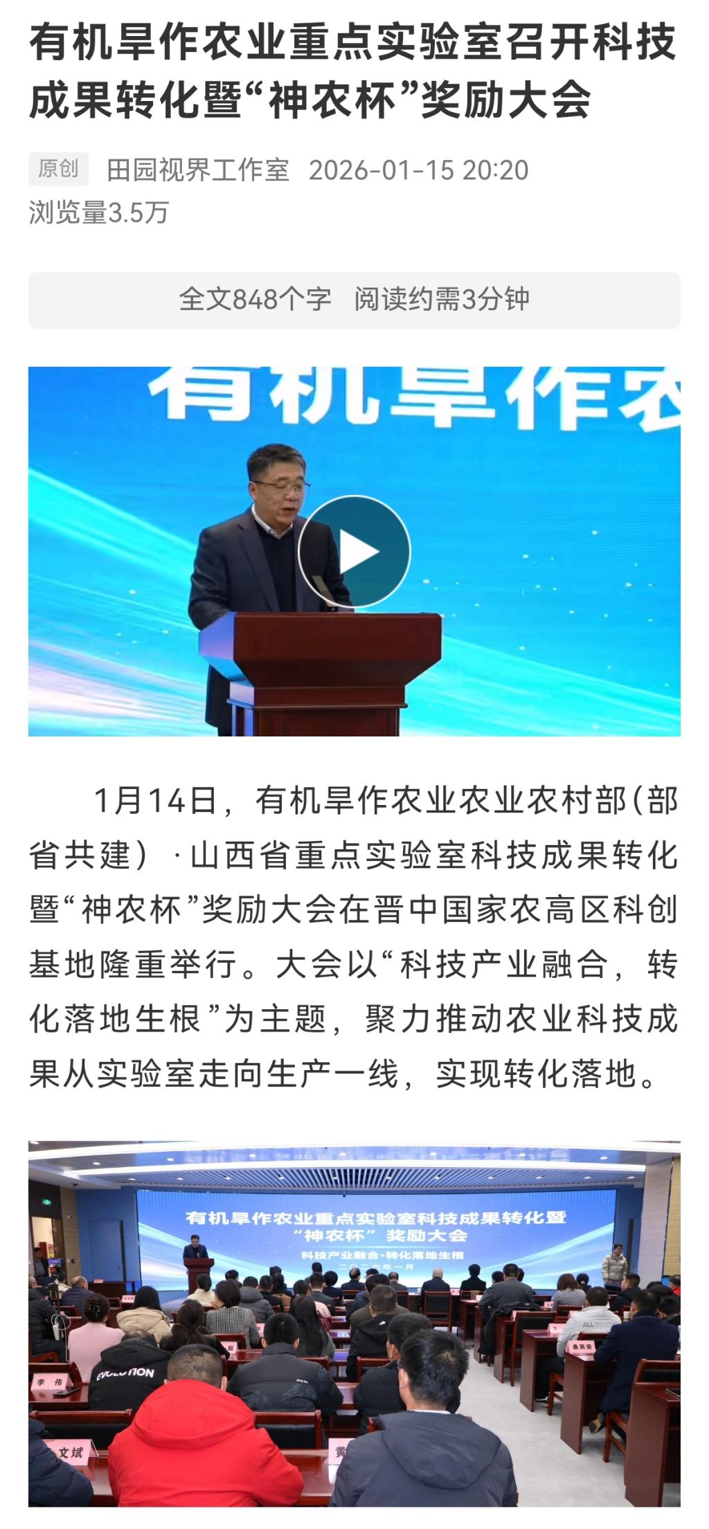 1月14日,有机旱作农业农业农村部(部省共建)·山西省重点实验室科技成果转化暨“神农杯”奖励大会在晋中国家农高区科创基地隆重举行。大会以“科技产业融合,转化落地生根”为主题,聚力推动农业科技成果从实验室走向生产一线,实现转化落地。