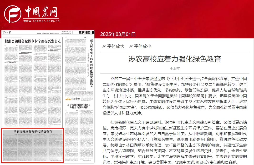 党的二十届三中全会审议通过的《中共中央关于进一步全面深化改革、推进中国式现代化的决定》提出,“聚焦建设美丽中国,加快经济社会发展全面绿色转型,健全生态环境治理体系,推进生态优先、节约集约、绿色低碳发展,促进人与自然和谐共生”。《中共中央、国务院关于全面推进美丽中国建设的意见》要求,把建设美丽中国转化为全体人民行为自觉。生态文明建设是关系中华民族永续发展的根本大计。涉农高校胸怀“国之大者”,服务强国建设,必须着力强化绿色教育,为全面推进美丽中国建设提供人才和智力支持。