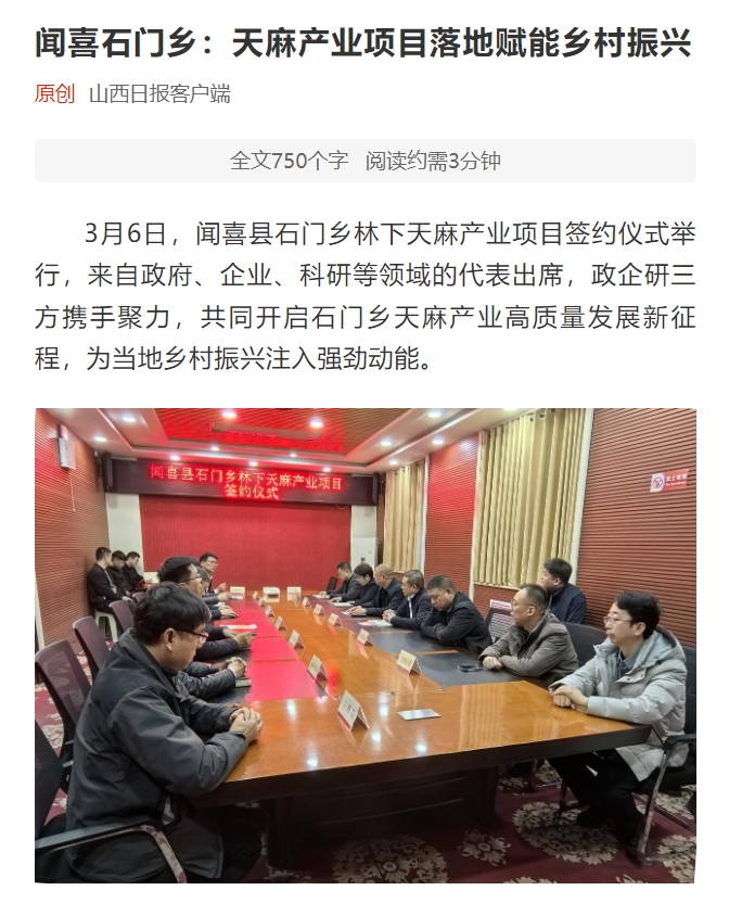 3月6日,闻喜县石门乡林下天麻产业项目签约仪式举行,来自政府、企业、科研等领域的代表出席,政企研三方携手聚力,共同开启石门乡天麻产业高质量发展新征程,为当地乡村振兴注入强劲动能。