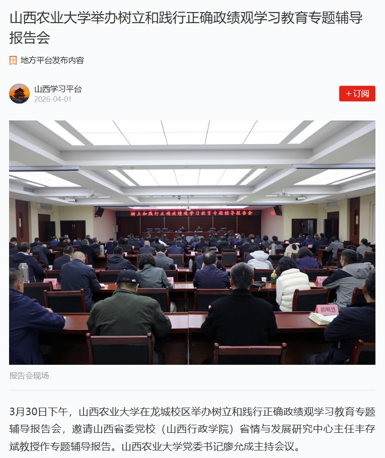 3月30日下午,山西农业大学在龙城校区举办树立和践行正确政绩观学习教育专题辅导报告会,邀请山西省委党校(山西行政学院)省情与发展研究中心主任丰存斌教授作专题辅导报告。山西农业大学党委书记廖允成主持会议。