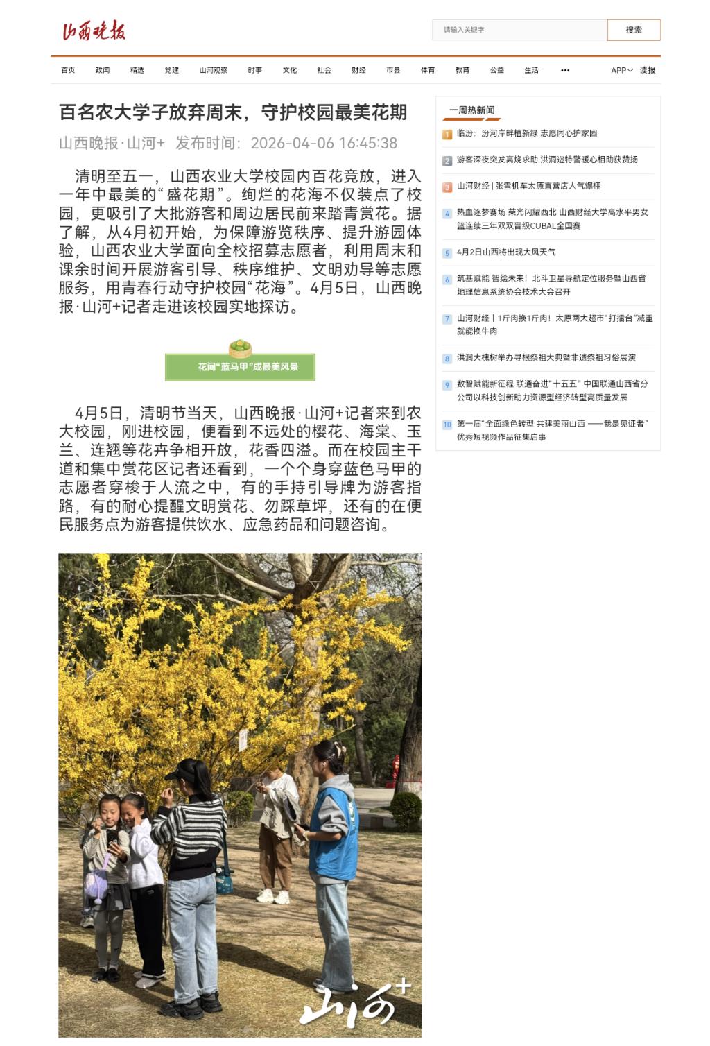 清明至五一,山西农业大学校园内百花竞放,进入一年中最美的“盛花期”。绚烂的花海不仅装点了校园,更吸引了大批游客和周边居民前来踏青赏花。据了解,从4月初开始,为保障游览秩序、提升游园体验,山西农业大学面向全校招募志愿者,利用周末和课余时间开展游客引导、秩序维护、文明劝导等志愿服务,用青春行动守护校园“花海”。4月5日,山西晚报·山河+记者走进该校园实地探访。