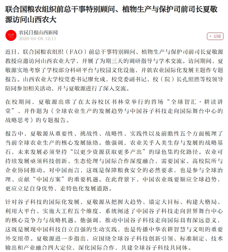 近日,联合国粮农组织(FAO)前总干事特别顾问、植物生产与保护司前司长夏敬源教授应邀访问山西农业大学,开展了为期三天的调研指导与学术交流。访问期间,夏敬源实地考察了学校部分科研平台与校园文化设施,并就农业国际化发展主题作专题报告。山西农业大学校党委书记廖允成,校党委副书记、校(院)长孔照胜等校领导陪同参加相关活动,并与夏敬源进行了深入交流。