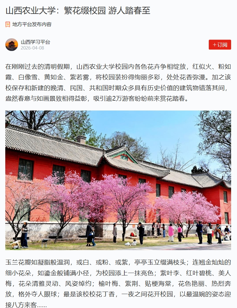 在刚刚过去的清明假期,山西农业大学校园内各色花卉争相绽放,红似火、粉如霞、白像雪、黄如金、紫若雾,将校园装扮得绚丽多彩,处处花香弥漫。加之该校保存和新建的晚清、民国、共和国时期众多具有历史价值的建筑物错落其间,盎然春意与如画景致相得益彰,吸引逾2万游客纷纷前来赏花踏春。
